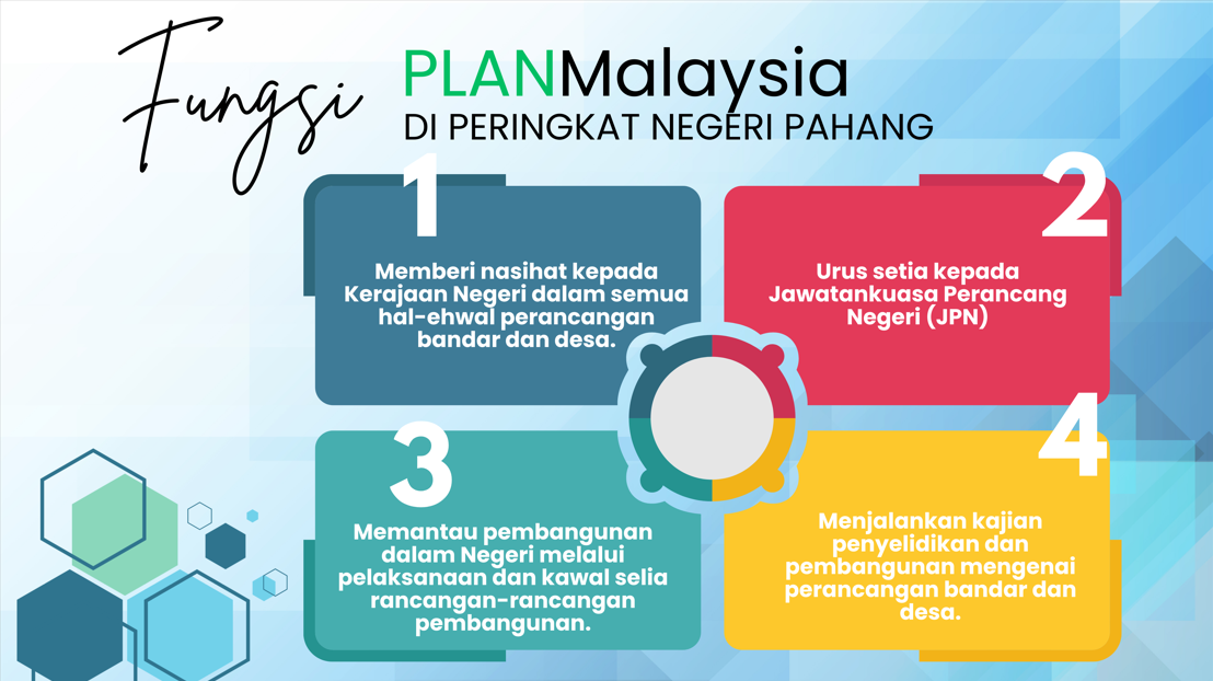 - Memberi maklumbalas / ulasan di dalam Rancangan Fizikal Negara (RFN) dan Rangka Kerja Wilayah Bersepadu (RWB);
