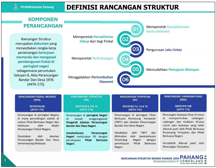 Dasar dan cadangan-cadangan am berkenaan dengan pemajuan dan penggunaan tanah, termasuk langkah-langkah bagi memperelokkan persekitaran hidup dari segi fizikal, perhubungan, pengurusan lalu-lintas, kesejahteraan, sosio-ekonomi, menggalakkan pertumbuhan ekonomi serta pembangunan mampan;